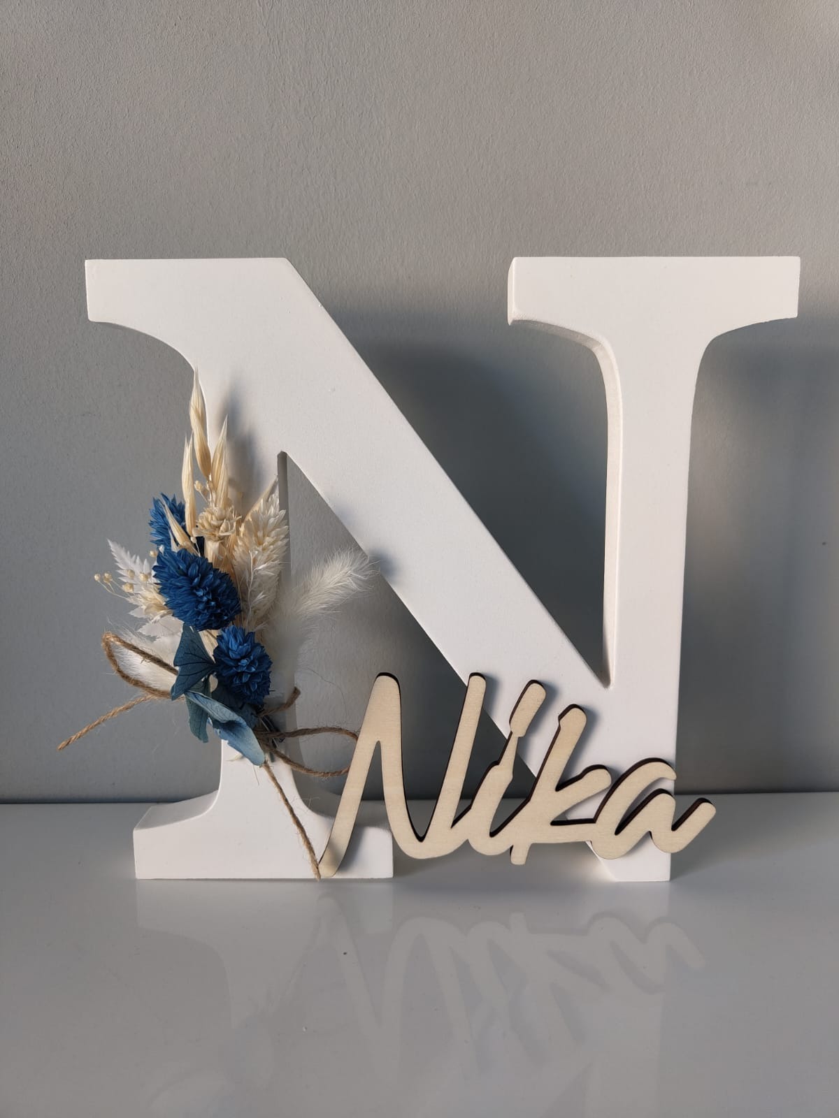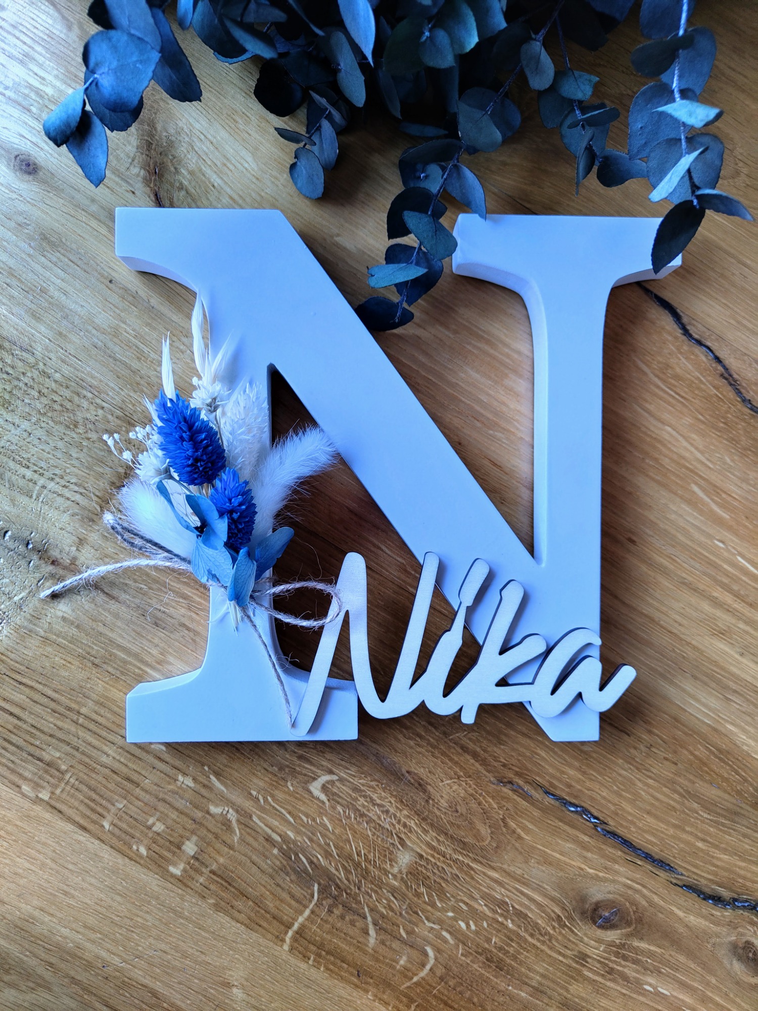 Der Name wird aus 4mm Pappelsperrholz gelasert und auf den Holzbuchstaben angebracht. Der Name ist naturbelassen.