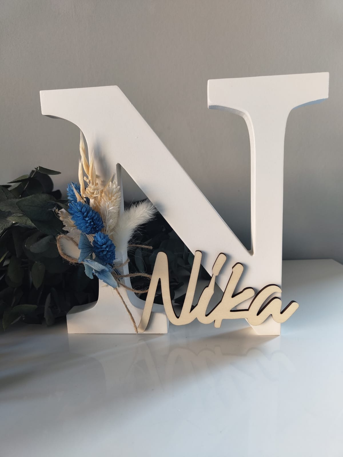 Der Name wird aus 4mm Pappelsperrholz gelasert und auf den Holzbuchstaben angebracht. Der Name ist naturbelassen.